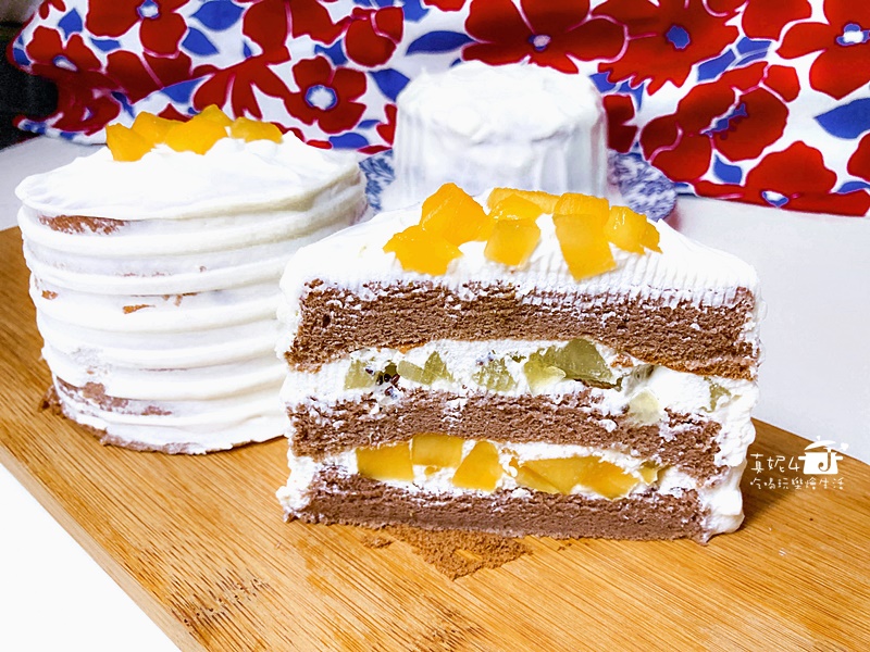 4吋水果夾心蛋糕,我用3顆雞蛋做3個4吋3層夾心蛋糕,夾餡鮮奶油和奇異果和芒果果丁