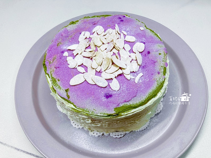 20.蛋糕外圈擠原味奶油霜抹平後用有紋路的刮板畫一圈,蛋糕頂也均勻擠一圈抹茶奶酪奶油霜抹平後再把紫薯奶油霜也擠好並抹平後冷藏3小時以上(定型)