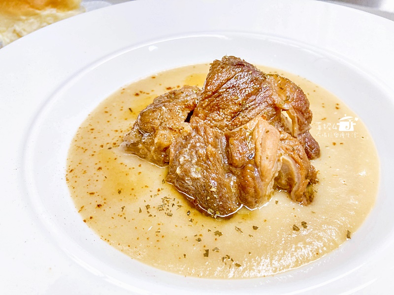 8.盛盤:盤裡舀兩勺薯泥醬汁,擺上燉到軟爛的排骨肉,點綴一點乾燥的巴西里,搭配餐包或土司~開動美味大餐,醬汁裡有綿綿不絕的肉味香,薯泥口感非常輕盈滑順~超好吃