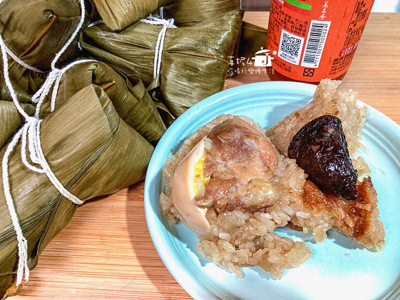 要包進粽子裡的配料有滷煮的雞腿肉、雞蛋、香菇、蘿蔔乾